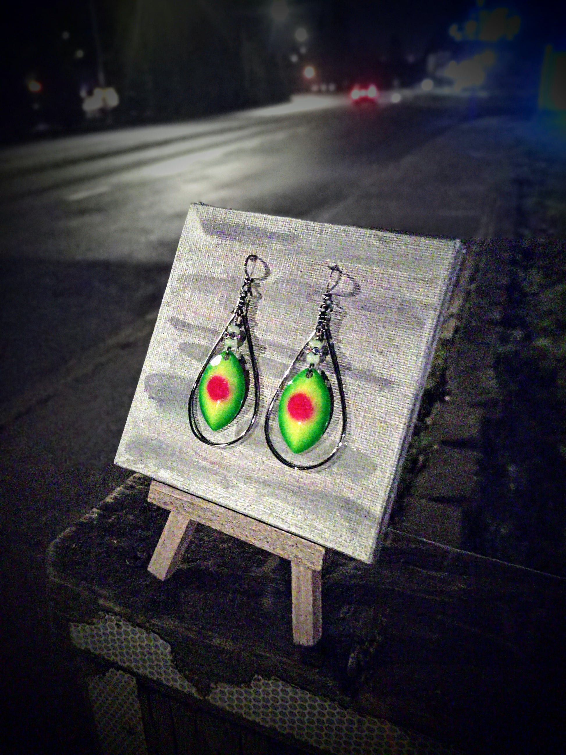 Framed Spinner blade style earrings at it's most wild color style, our most popular style earrings with the wildest color theme we offer is quite by far just that, wild! The neon green to deep greenish color pattern with a can't miss redish burnt orange right in the center, making them original and exactly where you will be when you wear them, right in the middle of the conversation the room, the middle of everything because you will radiate that persona that draws everything and every body right to you, eye catching amazement with personality and a badass but humble attitude is who you are in earring form, be the show stopping jaw dropping center of attention when you wear these earrings, it's your world so be the center of it and take control of every angle!